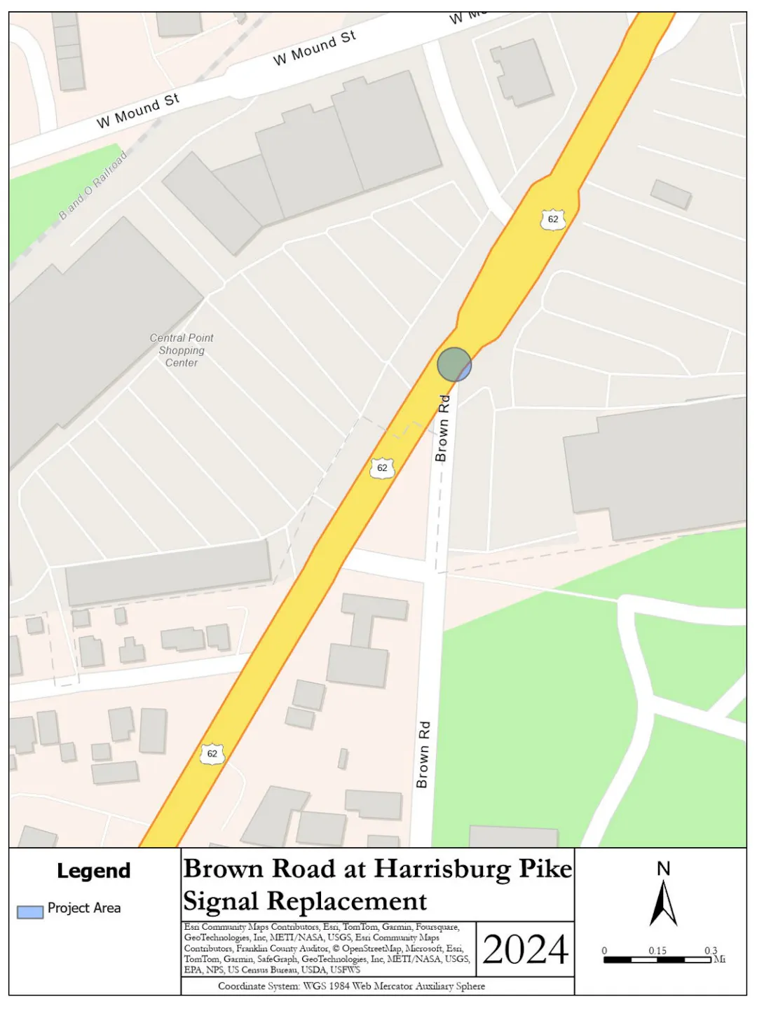 This project will replace the existing traffic signal at the intersection of Brown Road at Harrisburg Pike (US62). Curb ramps will be installed at the intersection. Intersection improvements will be installed to go along with the new signal.