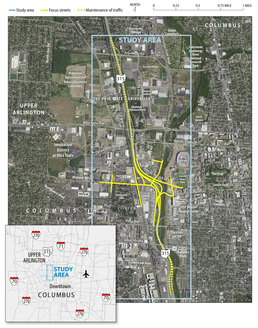 The scale of the overall Columbus Region N. KNOT project has required it to be phased: one phase is the SR 315 at Lane Avenue phase; and the other phase is the SR 315 at Kinnear Road and Medical Center Drive phase. The Ohio Department of Transportation’s (ODOT’s) Transportation Review Advisory Council (TRAC) has just recommended Columbus Region N. KNOT: SR 315 at Lane Avenue phase receive project development funding as part of ODOT’s Major New Capacity Program. TRAC has a statutory mandate to oversee the prioritization and approval of funding projects that have costs exceeding $12 million; increase capacity or reduce congestion; and are critical to the mobility, economic development, and quality of life for the citizens of Ohio. ODOT has identified the Columbus Region N. KNOT project overall as a project that meets this legislative mandate through its funding recommendation for the SR 315 at Lane Avenue phase. Columbus is requesting USDOT also recognize the importance of overall Central Ohio N. KNOT project to Ohio, and award the SR 315 at Kinnear Road and Medical Center Drive phase an $18.5 million BUILD planning grant to fund its preliminary engineering and final design.