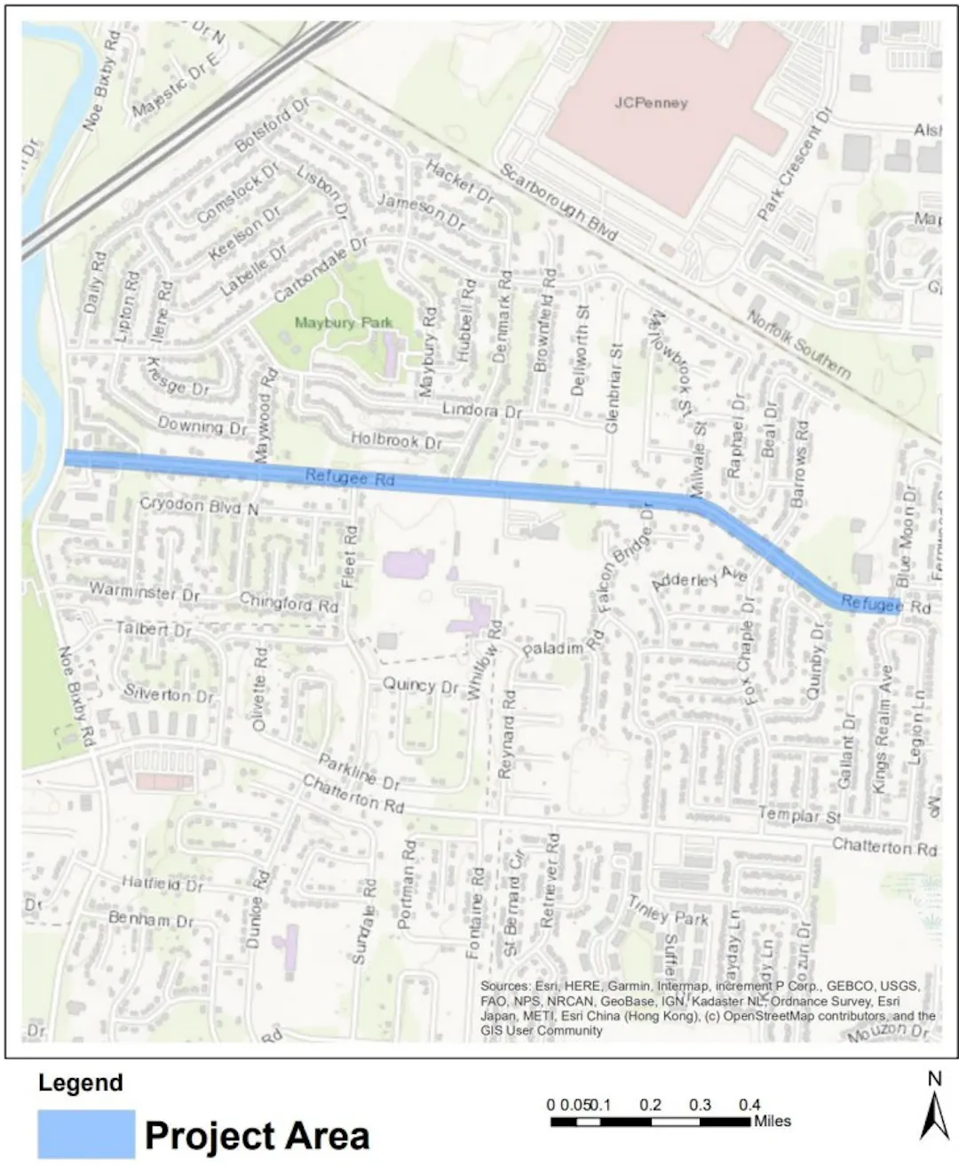 This project will construct sidewalk along the north side of Refugee Rd from Noe Bixby Rd to Blue Moon Dr, and on the south side of Refugee Rd from Noe Bixby Dr to existing sidewalk just west of Glenbriar St. Installation of the sidewalk will include curb, curb ramps and drive approaches, and may include stormwater drainage improvements in select areas.